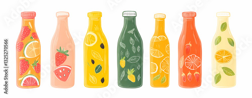 Colorful Fruit Smoothies: A collection of vibrant glass bottles filled with refreshing fruit smoothies, each adorned with delightful illustrations of the fruits used. Perfect for summer refreshment.