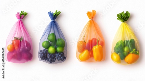 Colorful Fruits in Mesh Bags with a White Background. Generative AI