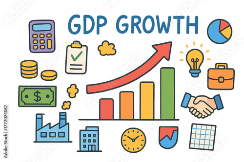 Colorful GDP Growth Doodles. GDP growth. Colorful Hand-drawn doodle Children illustration GDP growth bar chart, arrow up, calculator, coins, banknote, factory,