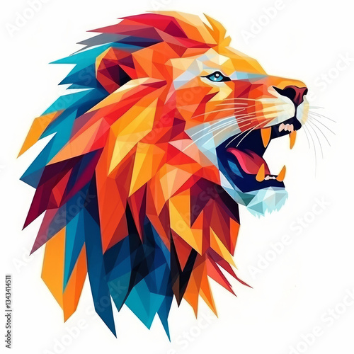 Colorful geometric illustration of a roaring lion, featuring vibrant shades of blue, orange, and yellow.