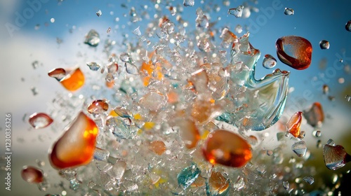 Colorful glass shards and droplets create dynamic explosion against clear sky backdrop