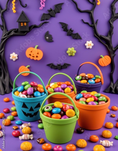 Colorful Halloween Candy in Buckets on Purple Background with Decorations and Treats