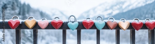 Colorful heart-shaped locks on a snowy railing, symbolizing love and commitment in a picturesque winter landscape.