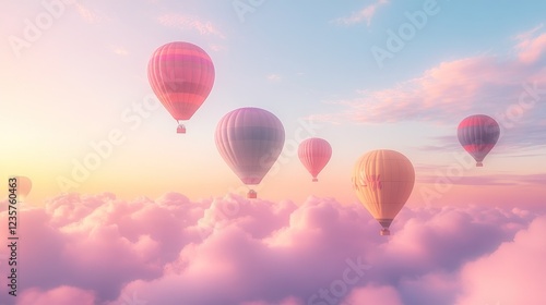 Colorful hot air balloons soar above pink clouds at sunset, travel poster