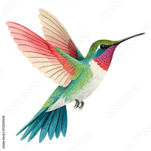 Colorful hummingbird with vibrant wings in minimal style, showcasing blend of pink, green, and blue hues, creating lively and dynamic appearance