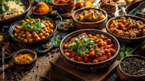 Colorful Indian Cuisine Spread Featuring Varied Dishes of Spices, Chickpeas, and Fresh Herbs on Rustic Wooden Table in Vibrant Lighting