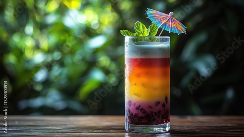 Colorful layered cocktail garnished with an umbrella served in a lush garden setting