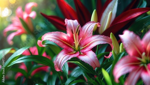 Colorful lilies in a garden with pink and red flowers and lush green foliage. Beautiful bloom, vibrant colors, and natural setting.