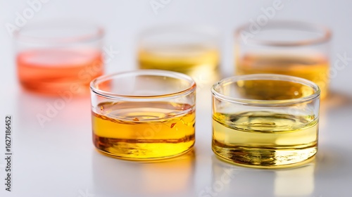 Colorful liquids in glass cups, Yellow, Orange colors on white surface