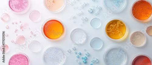 Colorful liquids in petri dishes with bubbles representing biotechnology research and cellular growth