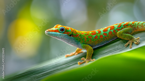 lizzard, reptile, green, orange, blue, yellow, scale, eye, toe, claw, leaf, plant, nature, wildlife, colourful, pattern, skin, animal, creature, perch