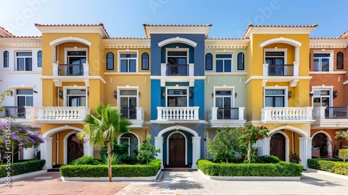 Colorful Modern Townhouses with Greenery in Bright Sunshine