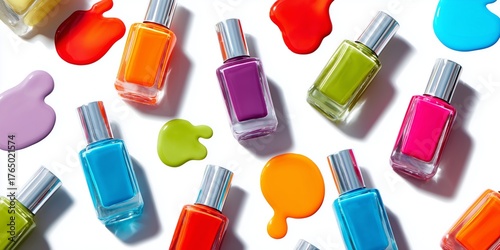 Colorful nail polish bottles arranged with vibrant spills on a white background