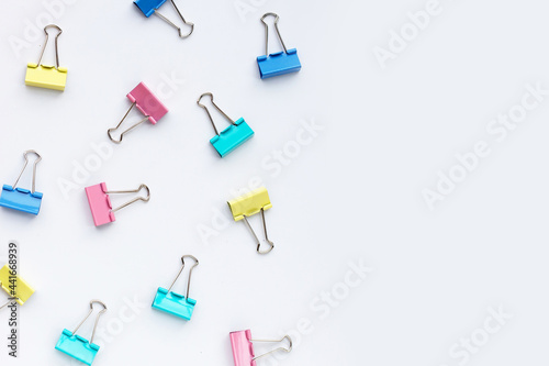Colorful office paper clips on white background.