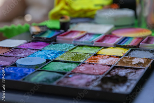 Colorful palette of face painting supplies displaying vibrant colors