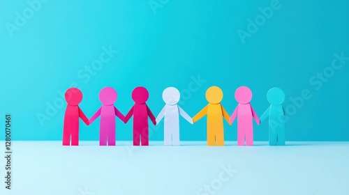 Colorful paper figures holding hands on a blue background representing unity, diversity, friendship, and teamwork in a cheerful and creative environment.