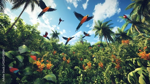 parrot, macaw, tropical, jungle, bird, flight, sky, cloud, sun, paradise, green, leaf, tree, palm, plant, flower, orange, red, blue, yellow, feather, wing, nature, wildlife, exotic, vibrant, bright, colourful, beauty, scene, landscape, view, amazon, forest, lush, foliage