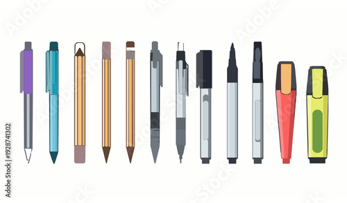 Colorful Pens Pencils and Markers Set Flat Vector Illustration Isolated on White Background