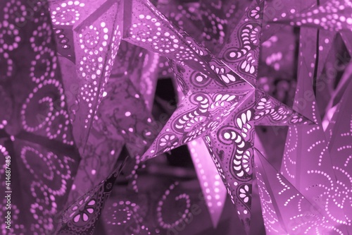 Colorful pink xmas lantern stars at christmas market season. Beautiful shiny star mood lamp in merry advent decoration. Traditional symbol of the best miracle time of the year. Part of series