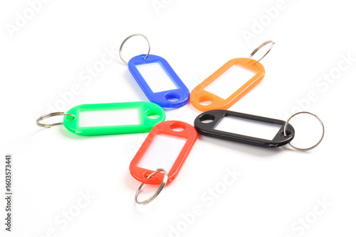 Colorful plastic key tag isolated on white background