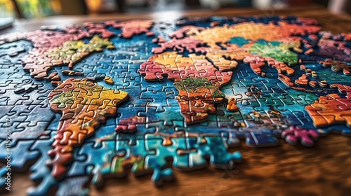 Colorful puzzle pieces form a detailed world map showcasing global geography and diversity