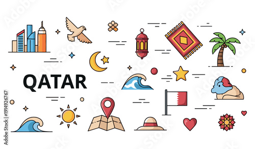 qatar, icon, landmark, culture, cartoon, traditional, palm, isometric, country, city, top, element, set, national, symbol, isolated, flat, three-dimensional, vector, skyline, architecture, crescent, flag, map, dove, lamp, wave, sun, nubes, rug, camel, star, moon, pattern, colours, design, decorative, travel, middle east, heritage, illustrative, artistic