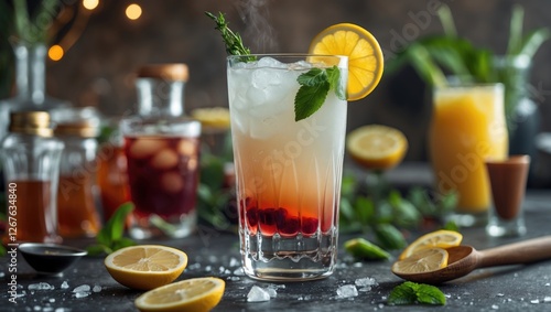 Colorful Refreshing Cocktail in Tall Glass Garnished with Lemon and Mint Surrounded by Ingredients and Ice on Dark Table