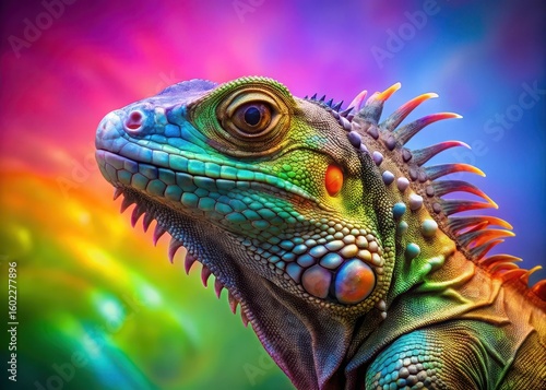 Colorful reptile with iridescent scales and intricate patterns on a digital gradient background