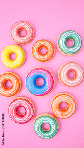 Colorful round donuts on pink background. Flat lay, top view, crayon drawing. White tone