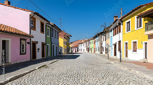 street, town, colourful, cobbled, house, architecture, building, facades, sky, blue, village, exterior, day, european, travel, destination, tour tourism, urban, residential, structure, road, perspective, sunny, historic, traditional, charming, culture, view, up, down, pattern, texture, brick, stone, roof, window, door, colours, bright, vibrant, summer, light, scenic, picturesque, quaint, city landscape, harmony