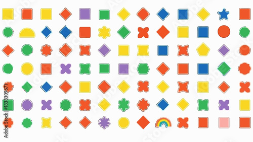 vector, shape, geometric, pattern, collection, set, colourful, abstract, design, figure, illustration, background, simple, flat, icon, element, decoration, kindergarten, children, education, circle, square, diamond, star, rainbow, red, blue, yellow, green, orange, graphic, digital, basic, seamless, wallpaper