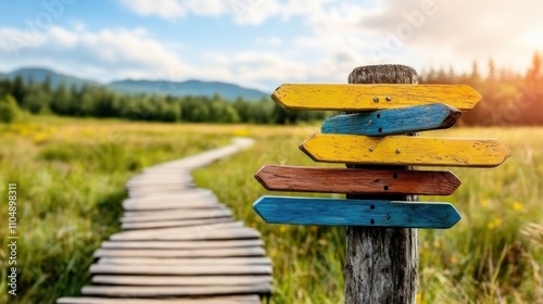 Colorful Signpost on Wooden Path Nature Trail Summer Landscape Travel Directions