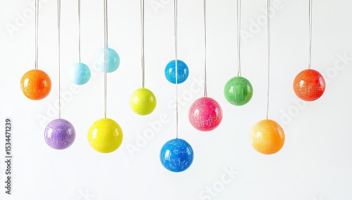 sphere, colourful, hanging, string, ball, pastel, vibrant, light, airy, delicate, suspended, white, background, design, artistic, simple, geometric, abstract, decoration, ornament, playful, joyful, cheerful, bright, texture, smooth, round, symmetric, art, object, minimal, still, life, composition, decor, colours
