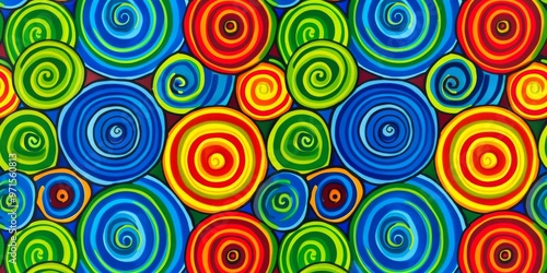 Colorful spiral patterns in vibrant hues of red, yellow, blue, and green create a lively and dynamic abstract artwork.