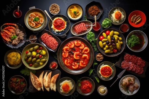 Colorful Spread of Delicious Dishes on Dark Background