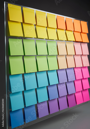 Colorful sticky notes arranged in rows on a transparent board displaying a rainbow gradient effect