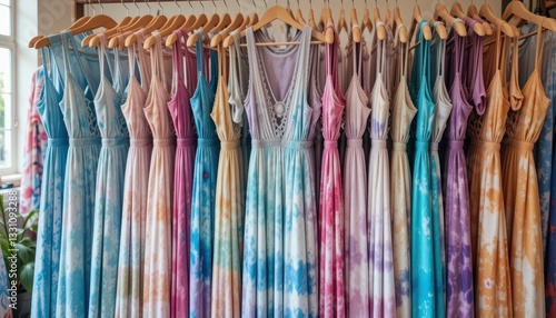 dress, tie-dye, fashion, boutique, clothing, colourful, textile, fabric, style, woman, summer, apparel, vibrant, hanger, shop, pattern, casual attire, trendy, modern, retail, design, uniqueness, garment, aesthetic, collection, pastel, hue, shades, hand-made, showcase, indoor, clothes rack, shopping, beauty, artsy, beautiful, cheerful, high-coloured, flowing, seasonal, inspiration, elegant, light, bright, chic