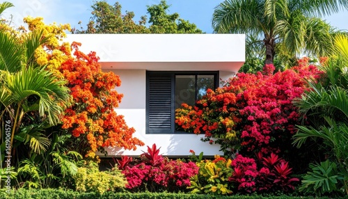 house, building, exterior, garden, plant, flower, tree, tropical, vibrant, colourful, red, orange, yellow, green, white, modern, architecture, window, shutter, lush, foliage, home, residential, property, landscape, design, bright, sunny, day, view