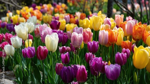 Colorful Tulip Garden in Spring Vibrant Bloom with Diverse Hues and Green Stems