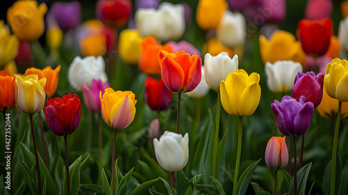tulip, flower, spring, colourful, garden, nature, blossom, vibrant, orange, red, yellow, white, purple, many-coloured, floral, bloom, outdoors, plant, green, beautiful, closeup, detail, springtime, colorful tulips, tulip field, flowerbed, garden flower, spring flower
