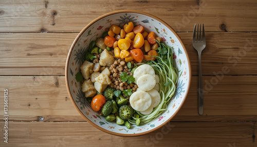 Colorful vegan bowl with fresh vegetables and chickpeas on wooden surface, perfect for healthy lifestyle, recipe blogs, and plant based food enthusiasts