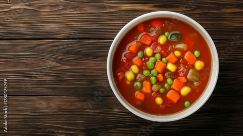 Colorful vegetable soup in a white bowl on a rustic wooden table.