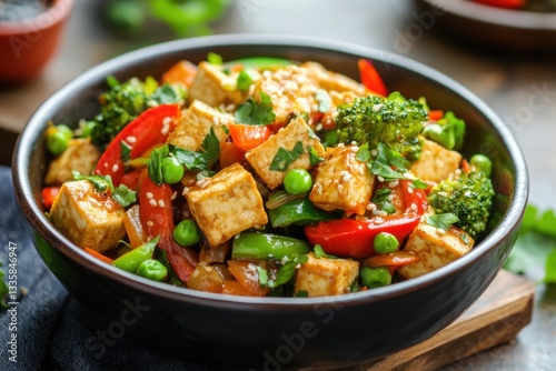 Colorful Vegetable Stir-Fry with Tofu and Fresh Herbs on Table