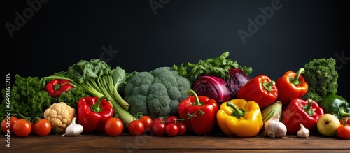 Colorful vegetables and fruits in a close up view yellow red and green in a kitchen setting as a healthy food advertisement or kitchen poster