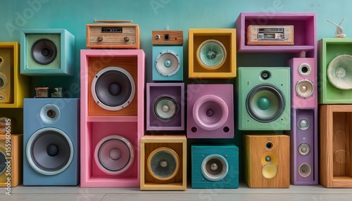 speaker, vintage, colourful, retro, wall, display, stereo, sound, music, box, framed, audio, design, modern, decor, vibrant, pastel, wooden