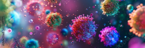 Colorful Viruses under microscope, Dangerous influenza or coronavirus cells for background