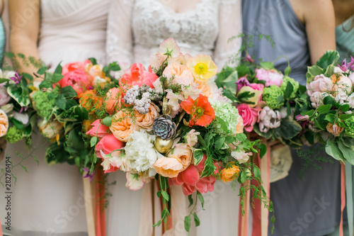 Colorful wedding bouquets, bride and bridesmaids holding wedding flowers, pink and orange ribbons, blue dresses, detail shot