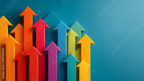 Colorful wooden arrows pointing upward on blue background symbolizing growth.