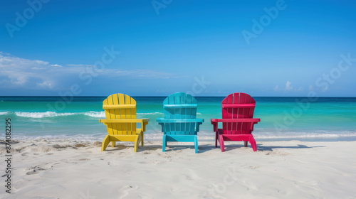 colorful wooden chairs on the beach with a blue sky and turquoise sea