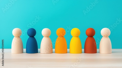 Colorful wooden figurines lined up against a bright turquoise background, showcasing a playful design and vibrant hues.